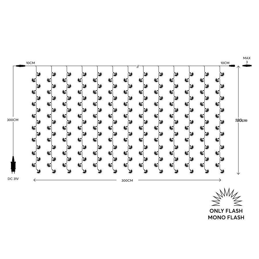 - Συνολικό Μήκος: 5m ( 3m κουρτίνα Υψος 1.80m + 2m καλώδιο πρίζα )